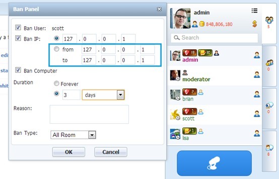 Admin can not only do the regular username, computer ID and IP ban but also make IP range ban now with the new html5 client for 123 Flash Chat. With this new feature, admin can ban a series of IPs within certain range. User will still stay in the current room even if his IP range is banned but cannot come back once he has exited the room by himself after his IP range was banned.