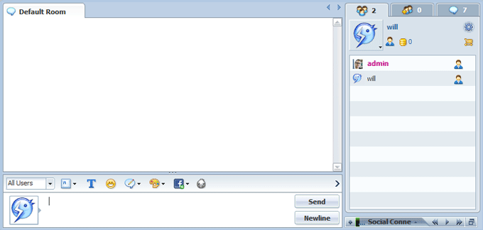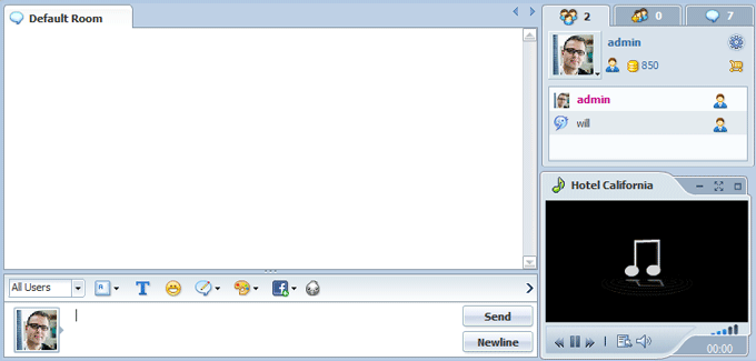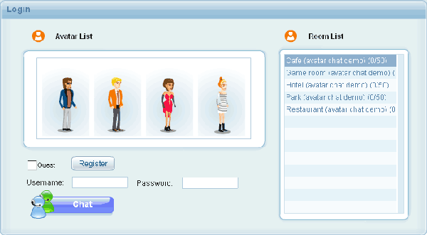 In this optional chat module, text chat room can be transformed to avatar chat in which you can walk around to "meet people" and gossip with them. The scenes are: cafe, game room, hotel, park, and restaurant. To log in avatar chat