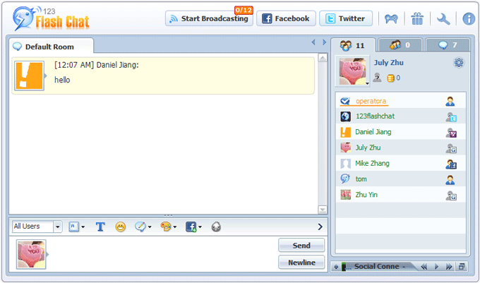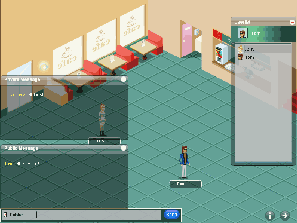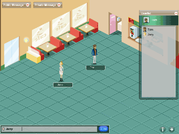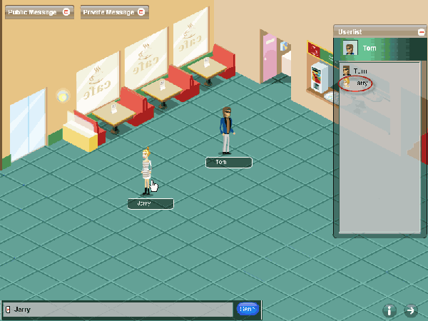 Select an avatar, fill in the required fields, select a room, click Chat, then you would be redirected to the room(let's take Cafe as an example): To walk around in the room To chat You can begin your chat by clicking the avatar or its username in the Userlist.
