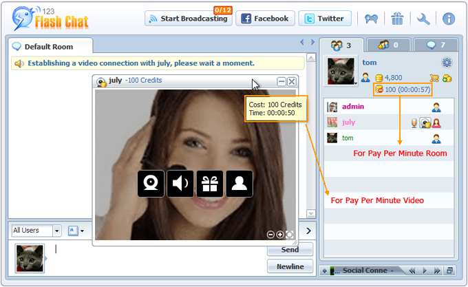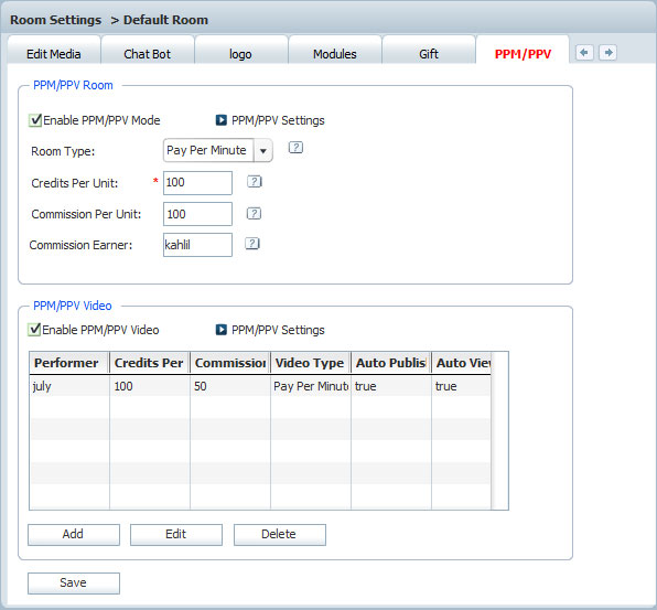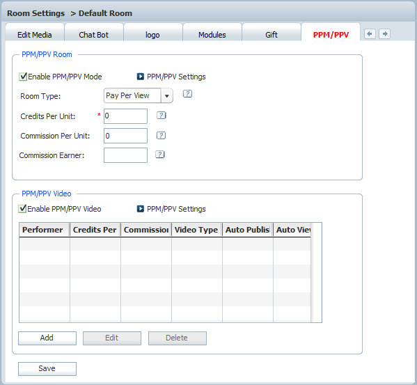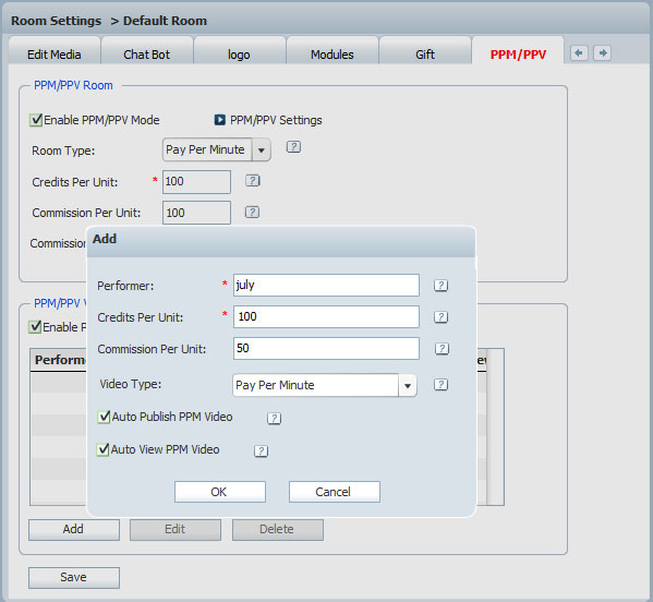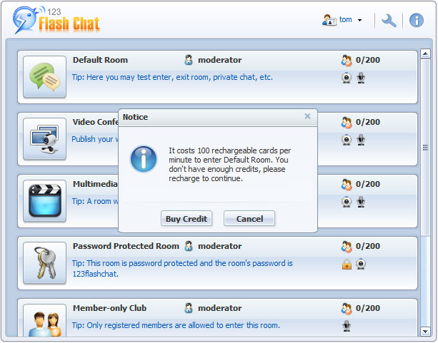 You can see in the above example, both PPM Room and PPM Video are enabled. So if Tom wants to enter a PPM chat room which costs 100 credits each time but he has not enough credits in his balance, then he will have to buy credits first.