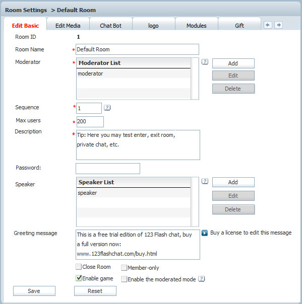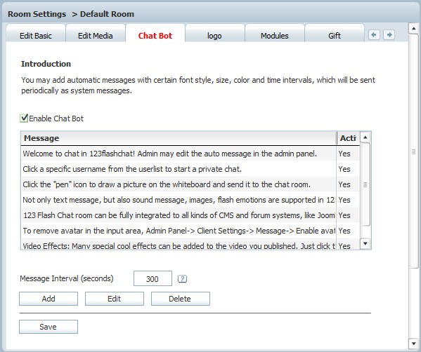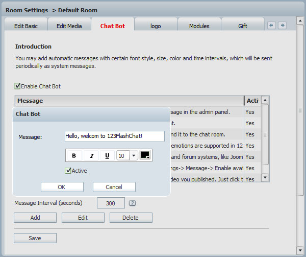 It can be used for site news or text advertisements. With Chat Bot, specific message(s) can be broadcast to specific rooms or all rooms at predefined intervals. Messages can be added, edited and removed from the list. There can be multiple messages for one room, or one message for all rooms. You can operate as follows: Click Enable Chatbot tab and then press Add, you can add message(s) you like to the blank listbox where the font size or shape can be edited by the buttons at the bottom. All the message(s) you have added can only be broadcasted by clicking Active button. You can also define the interval of message-broadcasting. After doing that, you can press Save to finish the whole process.