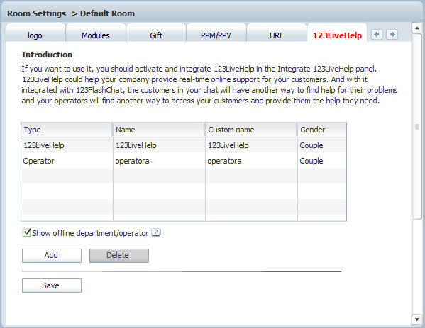 This function is designed for you to connect 123 Flash Chat with 123 Live Help so that the user can ask the corresponding supporter to solve the relevant problem. To configure its settings, first, you should check the "Activate 123LiveHelp function" checkbox in the Integrate 123LiveHelp panel. How to integrate 123livehelp to your chat room? Click the 123LiveHelp dropdown list and select one item among 123LiveHelp, Department or operator. Then select his/her name and gender, his/her name will be shown in this room. For example, we select the "Department" and "couple" respectively, and enter Custom name "tony", then click the Add button. Those information will be displayed in the following form. Click the Save button to save your settings and check the "Show as offline" checkbox. When this guy is offline, his status will be shown in this room as offline. Without checking that checkbox, when he is offline, his status won't be shown there, looking the following picture.