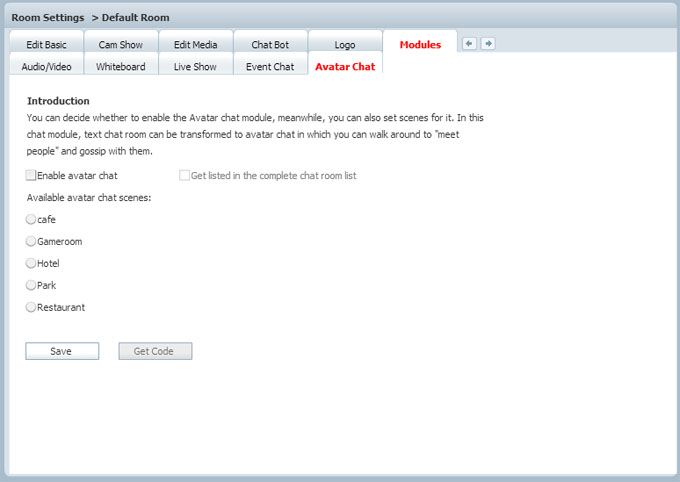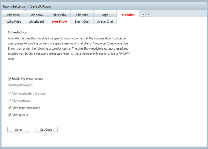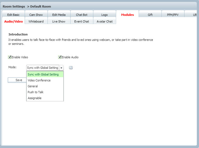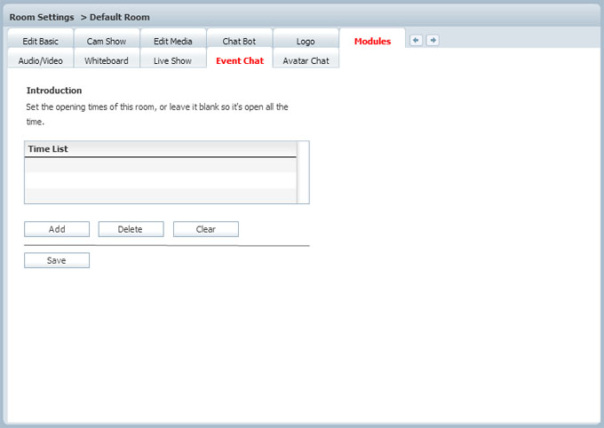 Click the "Modules" tab, the "Audio/Video", "Whiteboard", "Live Show", "Event Chat", "Avatar Chat" tabs will appear. Click each tab, a new panel will appear. What you can in those panels? Read the following document to get the answer.