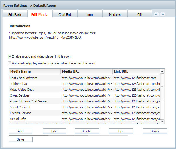 Check Enable music and video player in this room first and then press Add button , you can add the music and video with the media name entered in the left blank field and media URL in the right. Press Save button to complete this process. Checking Autoplay when users enter the room could make the room play music automatically when it is loaded. The support audio formats are mp3 and flv . A flash player playing mp3 file . A flash player playing flv file.