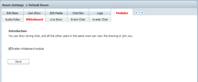 You can enable the whiteboard by checking Enable Whiteboard module and click Save to finish the process. Live Show