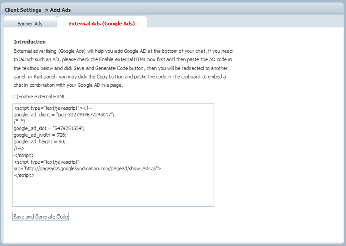 The panel will help you add Google AD at the bottom of your chat, if you need to launch such an AD, please check the Enable external html box first, paste the AD code in the textbox below and click Save and Generate Code button, then you will be redirected to another panel, in that panel, you may click the Copy button and paste the code in the clipboard to embed a chat in combination with your Google AD in a page.