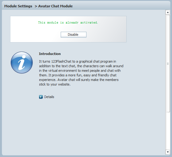 You can enable/disable this module by clicking Disable button. For more information, please click Details.