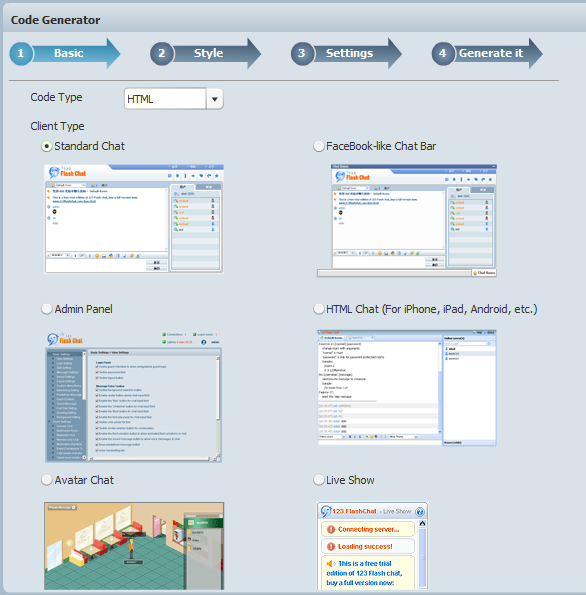 To generate code for your chat: 1.Select the code type you need to generate in Code Type drop-down list, considering its better compatibility performance, we recommend JavaScript. 2.You can choose the client type that you need to generate code here, they are may be Standard chat, Admin panel, Lite chat, Avatar chat, Html chat, Pocket PC chat or Banner chat. 3. Enter the size of client end, you may set it to specific size or full screen. If you set the minimize size, we recommend you to hide userlist for a more space of chat. And you can set to hide the uerlist: Admin Panel->Client Settings->Layout-> Default Display User List, check No and save.