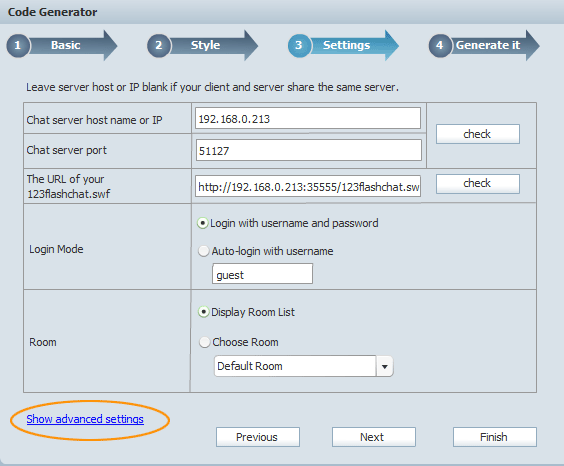 Select room that will show when loading. 8.If you need to configure the parameters of your Secondary server URL, Secondary TCP port, HTTP server address and HTTP port, please click Show advanced settings. More details, click here: http://www.123flashchat.com/index.php?page=crossproxy