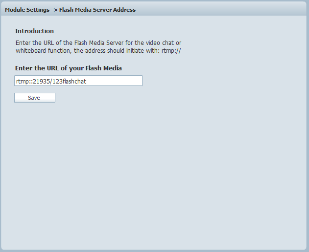 Enter the URL of the Flash Media Server for the video chat or whiteboard function, the address should initiate with: rtmp://, looking at the following picture.