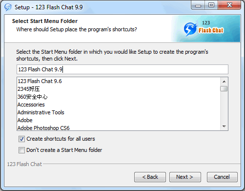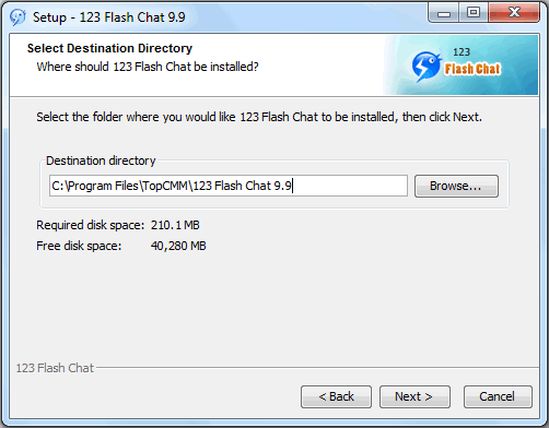 5. Enter your destination folder, for example C:Program Files123FlashChatServer9.9 and click Next.