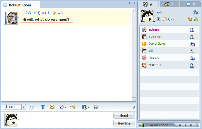 With it enabled, when a user enters chat room, a greeting would be delivered randomly. This feature would be helpful for the chat room used for live help; %YOURNAM% and %MYNAME% here are wildcards representing new-comer and administrator respectively.