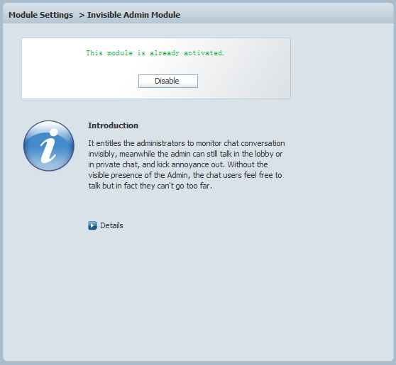 With this module enabled, administrator can monitor chat conversations invisibly, meanwhile he can still talk in the lobby or in private chat, and kick annoyance out. Without the "existence" of the admin, participants can chat freely, but the administrator can still monitor the chat.