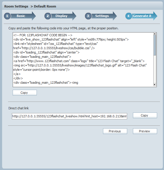 Here, you're getting the default length and theme for the live show code. If you want to set your own settings, please click the "Previous" button for several times to achieve them. As the below illustration shows. The left side chatting contents are the same as the contents of the Live Show box. When a new chatting message is entered to the left side, the Live Show Box contents will be refreshed simultaneously.