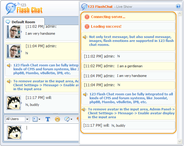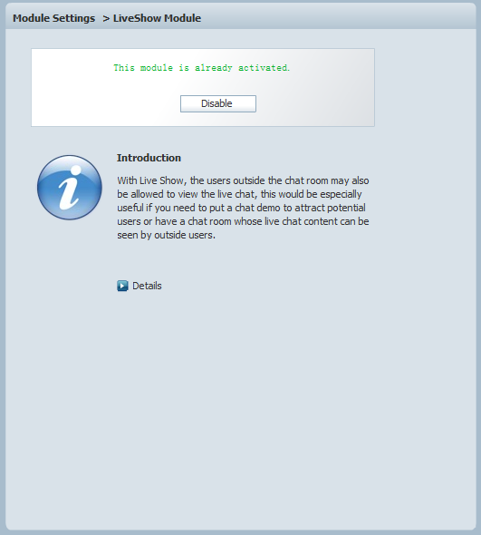 Live Show ModuleYou can activate/deactivate Live Show Module in this panel. With Live Show, the users outside the chat room may also be allowed to view the on-going chat inside the room, this would be especially useful if you need to put a chat demo to attract potential users or have a chat room whose live chat content can be seen by outside users. Click the "Room Settings" node and select whichever chat room you want to set up. You will see the "Modules" from its right side. Clicking it, the "Live show" tab will appear. Then click the "Live show" tab, you can define the words of the particular types of users (including moderators, speakers, regular members) to display or not in live show. As you see the "Enable moderator" and "Enable speaker" has been checked as default. You can check other 2 items and then don't forget to click the "Save" button.