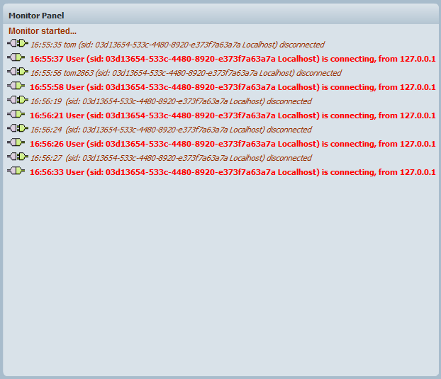With the monitor panel, you can monitor this information as follows: connecting information, user login and log out information, entering roon information, changing room information, exit room, disconnectiong information and so on, looking at the following picture.