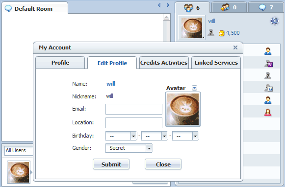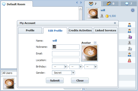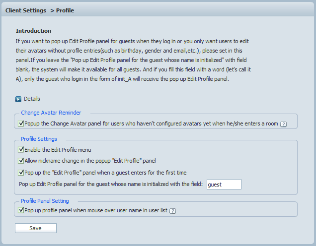 Disable Change NicknameIf "edit profile" is allowed but not the following item: "Allow nickname change in the popup Edit Profile panel", then users are prohibited to change nickname. Pop Up "Edit Profile" PanelTo pop up the "Edit Profile" panel automatically, please check "Pop up Edit Profile panel when a guest enters for the first time", then define a specific username initial to trigger the action. If leave the latter field blank, then all guests will see the popup panel.