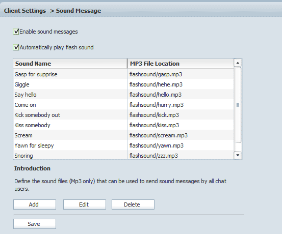 Audio files (MP3 only) that used to send out sound messages can be defined here.