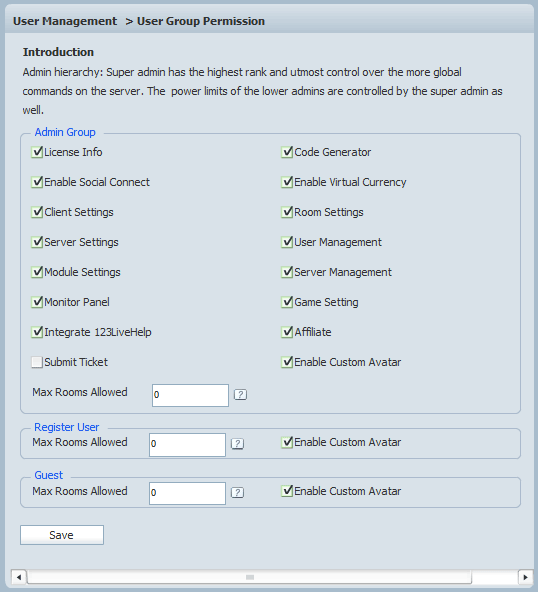 Admin rank system: The super admin has the upmost authority. The rights of an admin and custom avatar of members and guests are granted by the super admin, as well as the max rooms number for admin, members and guests to enter in one time, while "0" means no limitation. As the super admin, you can grant the rights to an admin in the below Admin Group Power and then click the "Save" button to save your settings.