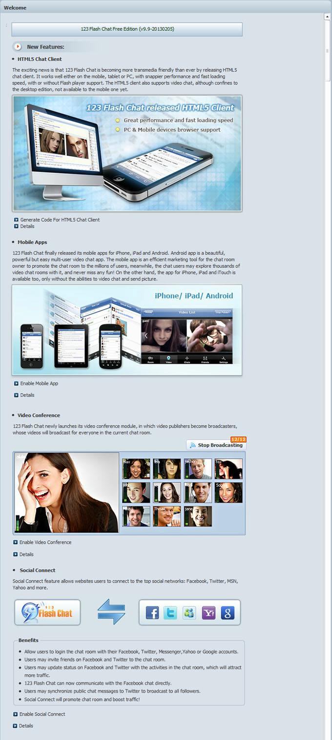 The welcome page highlights the cool new feature: Mobile Chat Apps, Video Broadcasting and Social Connect.