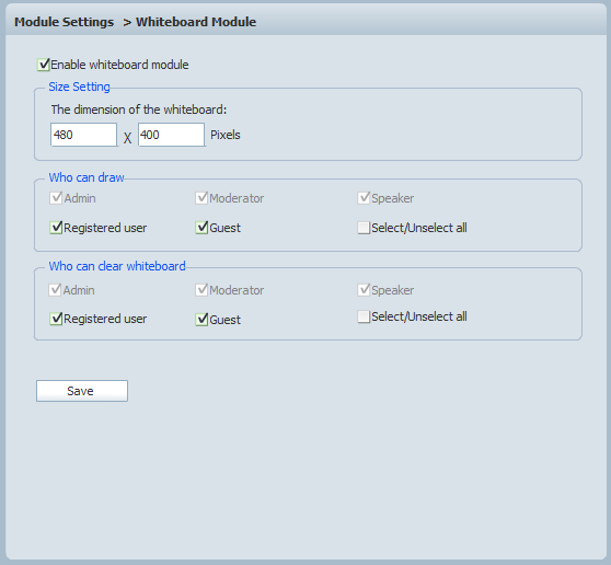 You can enable this module by checking Enable Whiteboard module . Here you can also set the dimension of this WhiteBoard and the user group who can draw or who can clear as shown in the picture above.