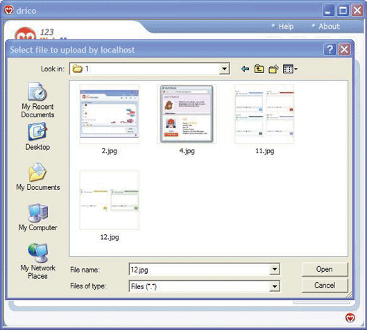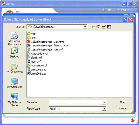 We have all experienced the inconvenience that couldn't transfer file or share a beautiful picture in a happy chatting time. Now, don't worry about it in 123 Web Messenger. File Transfer is coming! Admin can set the maximum size and acceptable format for a file conveniently. The default maximum is 10MB. If the bandwidth is your major concern, or your server is not so powerful, or your server hasn't enough room to store the pictures, you can restrict the maximum number. Of course, users could transfer pictures in private chat, too. And you will share and get the joy from many users. A preview will be shown automatically as soon as the image transfer is completed provided that the image is in format of jpg, png, bmp or gif. Now, the File Transfer Module is packed in demo of 123 Web Messenger version 2.2 & above. However, it is only available in Ultimate Edition of 123 Web Messenger at the moment. Please try it in demo or download it here | | | | How to use the File Transfer Module? Let's transfer an image here as an example. 1. Click the File Transfer Button Open the chat window, find and click the "send file" button, you will start to send a file. |  | | | 2. Select a file Click the button and a file browser window will popup. You could transfer any file. But please remember the default maximum is 10MB.