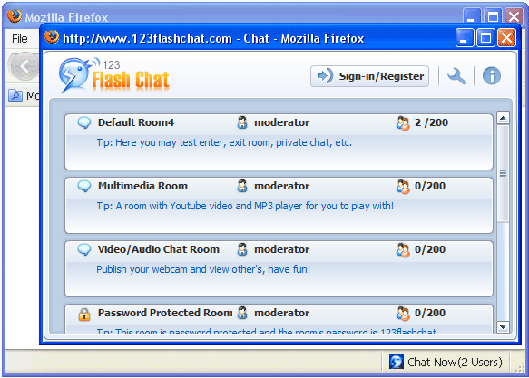Firefox Add-on123 Flash Chat's Firfox add-on will link your chat at the bottom of Firefox's status bar and enable a shorten access to your chat. To learn more about the feature, please click here. ![]() |