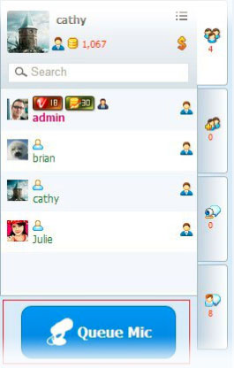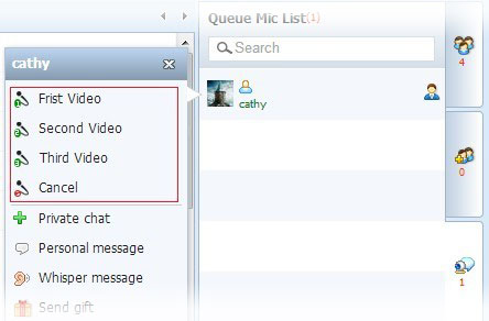 Hand Raising123 Flash Chat V10.0 optimizes video chat with an additional " assignable mode " for users to join the queue mic list to publish video. Given that the previous video conference mode has substantially aroused users' interest to join the chat and put their cameras on, the new hand raising feature will definitely liven the chat up and thus brings in more users to chat. What's more admin can set the yardstick to approve the hand raising requests thus it is an effective way to boost your chat revenue . How? How to raise hand to publish video?Users can apply to queue for broadcasting video by clicking the "Queue Mic" button. After clicking the button, it will lead you to choose your video devices to proceed and then, you will find yourself listed in the Queue. And users can click the "cancel" button to stop raising hand. Chat admins will be able to approve users' requests to publish the video and admins can authorize 1st,2nd and 3rd video or decline user's request. After the chat admin or moderators approved the request, users' video will be automatically enabled on the appointed position. Tips