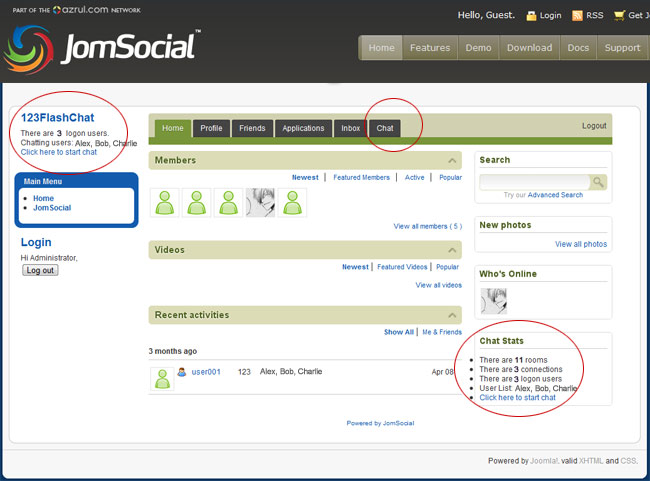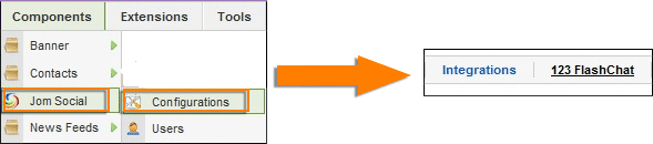 To add a feature-rich chat room to your JomSocial, please refer to the following instructions. Firstly, please download JomSocial chat module, and uncompress the package.  Then copy files. 1. Copy: components/com_community/views/chat/index.html To: <JomSocial installed directory>/components/com_community/views/chat/index.html 2. Copy: components/com_community/views/chat/metadata.xml To: <JomSocial installed directory>/components/com_community/views/chat/metadata.xml 3. Copy: components/com_community/views/chat/view.html.php To: <JomSocial installed directory>/components/com_community/views/chat/view.html.php 4. Copy: components/com_community/views/chat/view.iphone.php To: <JomSocial installed directory>/components/com_community/views/chat/view.iphone.php 5. Copy: components/com_community/login_chat.php To: <JomSocial installed directory>/components/com_community/login_chat.php 6. Copy: components/com_community/helpers/chat.php To: <JomSocial installed directory>/components/com_community/helpers/chat.php 7. Copy: administrator/components/com_community/views/configuration/tmpl/chatconfig.php To: <JomSocial installed directory>/administrator/components/com_community/views /configuration/tmpl/chatconfig.php Then install this module, please login your website admin panel -> Extensions -> Install -> Upload Package File: upload com_flashchat.zip and upload mod_chatstatus.zip Secondly, edit files, 1. Edit table: jos_community_config.config Go to your joomla social database(joomla social database) -->jos_community_config(table) -->config (field). Note: please don't visit your Jomsocial website when you are editing files, or it will show errors. Add the default Data as following, and you can edit them in your website admin panel. extendserver=1 clientlocation=http://localhost/client/ clientswfname=123flashchat.swf chatdatapath=C:/Program Files/123FlashChat7.7/server/data/default/ chatroomname=default primaryhost=localhost primaryport=51127 chatgroup=default chatwidth=634 chatheight=476 chat_fullscreen=1 hostingmode=2 showchat=1 2. Open File: http://<JomSocial installed directory>/administrator/components/com_community/views/configuration/tmpl/navigation.php Find <li><a id="integrations"><?php echo JText::_( 'CC INTEGRATIONS' ); ?></a></li> After Add <!--123 FlashChat--> <li><a id="123flashchat"><?php echo JText::_( 'CC CHAT' ); ?></a></li> <!--123 FlashChat--> 3. Open File: http://<JomSocial installed directory> /administrator/components/com_community/views/configuration/tmpl/default.php Find </div> <div class="clr"></div> Before Add <!--123 FlashChat--> <div id="page-123flashchat"> <table class="noshow"> <tr> <td width="50%"> <?php require_once( dirname(__FILE__) . DS . 'chatconfig.php' ); ?> </td> <td> </td> </tr> </table> </div> <!--123 FlashChat--> 4. Open File: http://<JomSocial installed directory>/administrator/language/en-GB/en-GB.com_community.ini Find CC SHOW ACTIVITY CONTENTS TIPS=Show activity contents during page load. Disable it to use the more link. After Add #123 FlashChat CC CHAT=123 FlashChat CC 123 FLASHCHAT CONFIGURATION=123 FlashChat Configuration CC ENABLE 123 FLASHCHAT IN PROFILE=Enable 123 FlashChat in profile CC ENABLE 123 FLASHCHAT IN PROFILE TIPS=Enable or disable 123 FlashChat Link from showing up in users profile. CC HOSTING MODE=Hosting Mode CC HOSTING MODE TIPS=If your chat server and Joomla web server are in the diffrent server(Including the chat rooms that hosted by 123flashchat) CC HOSTING MODE1=Chat server is hosted by your own CC HOSTING MODE2=Chat server is hosted by 123FlashChat.com CC HOSTING MODE3=Chat server is hosted by 123FlashChat.com free of charge CC CLIENT LOCATION=Client location CC CLIENT LOCATION TIPS=The client's location is the string of an URL or a directory where chat client is located CC SWFNAME=Client swf's name CC SWFNAME TIPS=Client swf's name,it should be 123flashchat.swf if you haven't changed its name CC CHATDATAPATH=Chat data path CC CHATDATAPATH TIPS=The chat data path's location,if your chat room is losted by us,just leave it blank CC CHATROOMNAME=Chat room name CC CHATROOMNAME TIPS=The chat room's name,it will be your site name if you leave it blank CC PRIMARYHOST=Primary server host CC PRIMARYHOST TIPS=The primary server's host value,if you use 123flashchat.com server the host is www.123flashchat.com. else you use your local server the host is localhost CC PRIMARYPORT=Primary server port CC PRIMARYPORT TIPS=The primary server's port value,if you use 123flashchat.com server the port is 51128. else you use your local server the port is 51127 CC CHATGROUP=Chat group CC CHATGROUP TIPS=The chat group's value,please leave it blank if you're using default group CC CHATWIDTH=Chat client width CC CHATWIDTH TIPS=The chat's client width CC CHATHEIGHT=Chat client height CC CHATHEIGHT TIPS=The chat's client height 5. Open File: http://<JomSocial installed directory>/language/en-GB/en-GB.com_community.ini Find CC PHOTO GALLERY=Photos After Add # Toolbar & menu items 123 FlashChat CC MY CHAT=123 FlashChat CC CHAT STATS=Chat Stats CC CHAT = Chat CC CHAT DISABLED=123 FlashChat have been disabled by the site administrator. 6. Login JomSocial Admin Panel ->Components->Jom Social ->Templates ->Select using Template Select File: frontpage.index.php 1) Find echo $header; After Add //123 FlashChat require_once(JPATH_ROOT . DS . 'components' . DS . 'com_community' . DS . 'helpers' . DS . 'chat.php'); //123 FlashChat 2) Find <li> <a href="<?php echo CRoute::_('index.php?option=com_community&view=profile&userid='.$row->id ); ?>"><img class="avatar jomTips" src="<?php echo $row->user->getThumbAvatar(); ?>" title="<?php echo cAvatarTooltip($row->user); ?>" width="40" height="40" alt="<?php echo $row->user->getDisplayName();?>" /></a> </li> <?php } ?> </ul> </div> <?php } ?> After Add <!--123 FlashChat--> <?php /** * ---------------------------------------------------------------------------------------------------------- * Chat Stats section here * -----------
