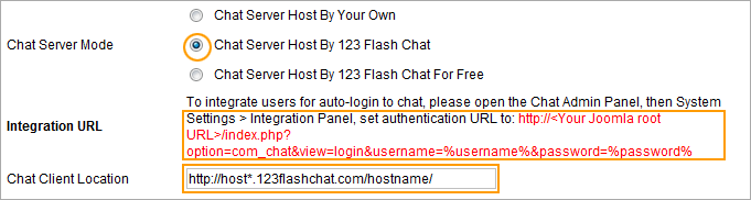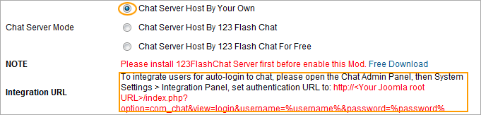 To add a feature-rich chat room to your Joomla, please refer to the following instructions. Firstly, download Joomla! chat extension.  Installation Level: Immediately Installation Time: ~5 Minutes Then install this module, please login your website admin panel -> Extensions -> Extension Manager -> Upload Package File: upload com_chat.zip and upload mod_chat.zip. Secondly, you need to enable chat module to appear on your website. Please login your website admin panel -> Extensions -> Module Manager, then find 123flashchat, and enable it.  Thirdly, configure Joomla chat extension's running mode, please login your website admin panel -> Extensions -> 123 Flash Chat -> Chat Settings.  1. Server Mode and Integration URL Here you may define the chat server mode (self hosted, TOPCMM paid hosting or TOPCMM free hosting) in the Basic Setting. If you choose Chat Server Host By Your Own, please set Auth-URL by the instructions that mentions from1.1~1.5.  If you choose Chat Server Host By 123 Flash Chat, not only you need to set Auth-URL by the instructions that mentions from1.1~1.5, but also write your Chat Client Location.  Or you choose Chat server Host By 123 Flash Chat For Free, please fill in your chat room name. (If you leave room name as blank, the default room name's value will be your domain's name.)