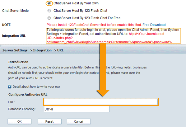 If you choose first mode or second mode, you need to set Auth-URL by the instructions below. 1.1 Log in the Chat Admin Panel from Joomla ACP. 1.2 Server Settings -> Integration ->DataBase -> SELECT: URL -> edit.  1.3 Change URL which has Auto-detected for you.  1.4 Press OK to save your setting. 1.5 Restart chat server at System Management -> Restart The following image describes how auth-URL integration works.