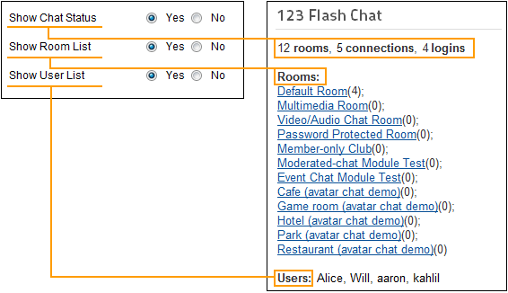 The Auth-URL application will perform as the communicating medium of the chat server and the database, i.e.: in fact, when a user logs on a chat server, the server won't connect to the user database directly, instead, it will send the username and password to the Auth- URL. Then the Auth- URL requests the database to authenticate the user. Finally, the Auth- URL will return the feedback to the chat server in a predefined way, whether approved or declined. 2. The following data of the chat room can display on Joomla index page to attract more users to join chatting. Total rooms, total connections, online users Chat room list Online user list The 3 types of data can be individually disabled to display if you need.