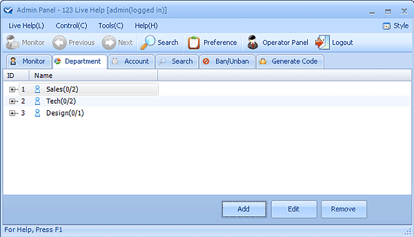 Here is a screenshot of the department management panel. As you can see, departments can be added, modified or deleted here.