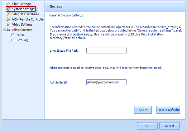 General SettingsThe information related to the online and offline operators will be recorded in the live_status.js. You can set the path for it in the below textbox.