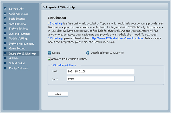 Integrate with 123 Flash ChatSince5.3.0, 123LiveHelp newly introduced a new functionality to integrate your 123LiveHelp with it. The new tool will give your customers another way to find a support staff and a more leisure environment to find a solution for his problem. How to integrate them? There are only 3 steps to finish the integration. 1. You log in the Admin Panel of your 123 Flash Chat and click the Integrate 123LiveHelp in the navigation panel: