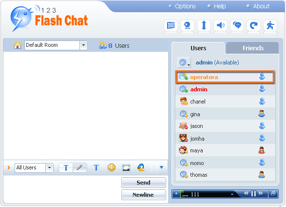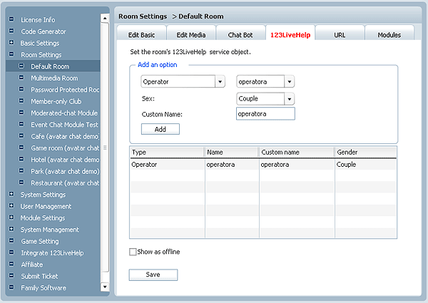 Click on the 123LiveHelp tab, select a role that will appear in this room, it can be 123LiveHelp, a department or a specific operator, and then its sex and its name. Taking this example, we added an operatora, his sex is Secret and his custom name is 123LiveHelp, when it is finished, click the Add button and the Save button in sequence. 3. Log in your 123LiveHelp as operatora, and go back to the chat panel of your 123 Flash Chat, you'll see a user named operatora is already in the room now.