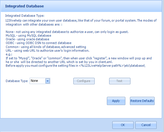 Integrated Database123 Live Help can integrate with your own user database, like that of your forum, or portal system. The modes of integration with other databases are: Related links: