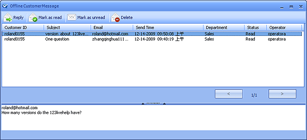 Offline MessageIf a customer needs to learn about a particular product while supporter or sales is offline, he can send a offline message from the client end, and when an operator in this department logs in 123 Live Help, the Message button will flash. This button locates at the menu bar of the operator panel.