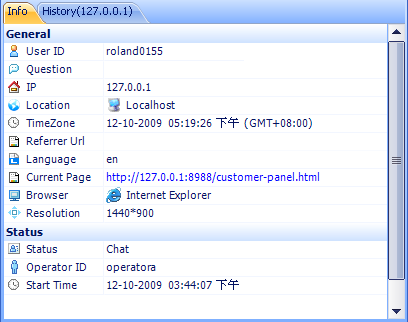 User Information PanelAt the right side of the monitor panel is a user information window showing the customer's information such as User ID, Question, IP, Time Zone, Language, etc.