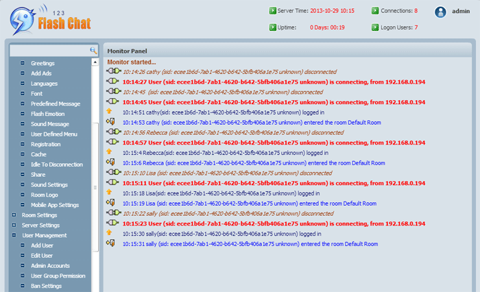 All user activities in your chat room are recorded in the Monitor Panel, including log in/ log out chat, enter/exit chat room, user sid (session ID), the sid is very important because admin may ban an offline user by banning his/her sid. And please be aware that different users names using the same computer will share the same sid.