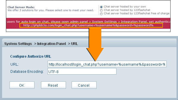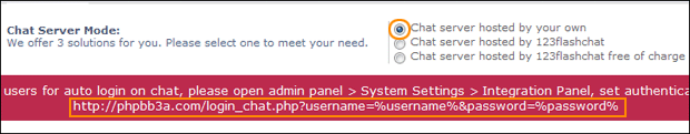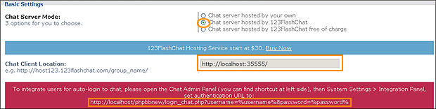 1. Server Mode and Integration URL Here you may choose the chat server mode (self hosted, TOPCMM paid hosting or TOPCMM free hosting) in the Basic Setting. If you choose Chat server hosted by your own, please set Auth-URL by the instructions that mentions from1.1~1.5.  If you choose Chat server hosted by 123FlashChat, not only you need to set Auth-URL by the instructions that mentions from1.1~1.5, but also write your Chat Client Location.(http://host*.123flashchat.com/group_name/)  Or you choose Chat server hosted by 123FlashChat free of charge, please fill in your chat room name. (If you leave room name as blank, the default room name's value will be your domain's name.)  If you choose first mode or second mode, you need to set Auth-URL by the instructions below. 1.1 Log in the Chat Admin Panel from phpBB ACP  1.2 System Settings -> Integrate Panel ->DataBase -> SELECT: URL -> edit  1.3 Change URL which has Auto-detected for you.  1.4 Press OK to save your setting. 1.5 Restart chat server at System Management -> Restart 2. The following data of the chat room can display on phpBB index page to attract more users to join chatting. Total rooms, total connections, online users Chat room list Online user list The 3 types of data can be individually disabled to display if you need.