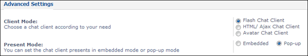 3. Various chat clients and different open modes You need to choose a chat client according to your need, as following: Flash Chat Client (standard, with full features), HTML/Ajax Chat Client (simple and neat) Avatar Chat Client (with walking cartoon figures). Also please set the chat client presents embedded or popup.