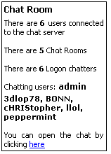 1) It can display following data in PostNuke: * connection number * logon user number * chat room number * chatter name list in all rooms. Postnuke Chat Block preview
