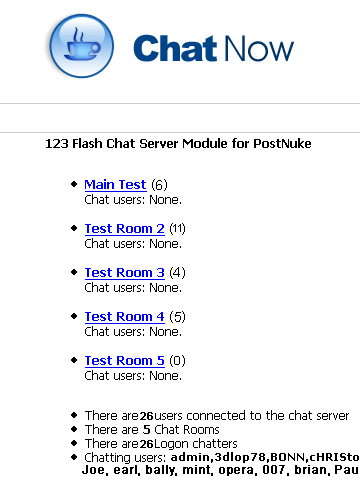 (123 Flash Chat is a shareware, with 10 concurrent users free edition.) 123 Flash Chat server software is a full-featured and high performance Java chat server with an amazing Flash chat client! It's a fast, easy and affordable way to host and manage real-time communication. 123 Flash Chat server software can integrate existing databases for forums or websites. It's fully customizable for admins and end-users. Online Demo1) PostNuke Chat Module and Chat Block Demo http://postnuke.123flashchat.com/ 2) General Demo of 123 Flash Chat Server Softwarehttp://www.123flashchat.com/demo.html You can select skins and languages to suit your needs. Download PostNuke Chat Module  File size: 23.4KB