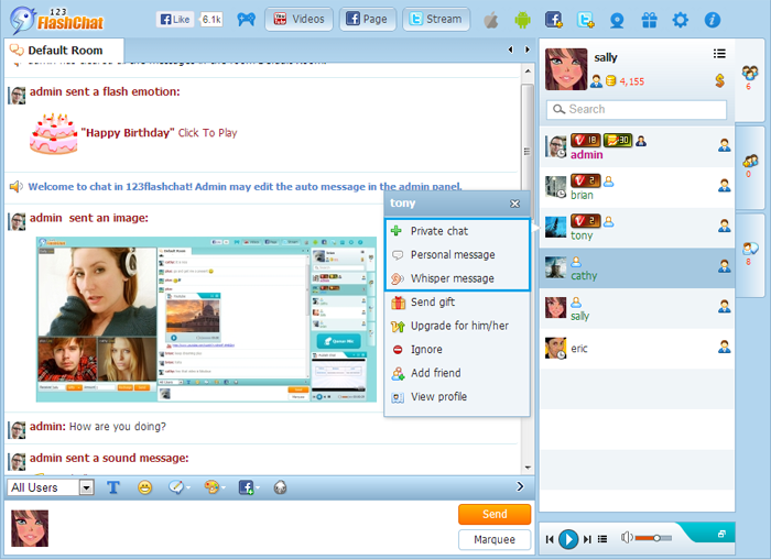 Public and Private ChatThere are various kinds of chat in 123 Flash Chat, group chat, private chat, personal message, whisper. Private chat is done in separate chat windows, while the personal message and whisper are both done in the chat lobby, the difference is that the personal message (A said to B) are visible to others, while the whisper message is only visible to the two parties involved. To chat in the chat lobby, just enter message and click Send. Otherwise there are two ways to deal with personal chat needs, right click or left click. Right Click Right click a user, and choose private chat, personal message or whispe.