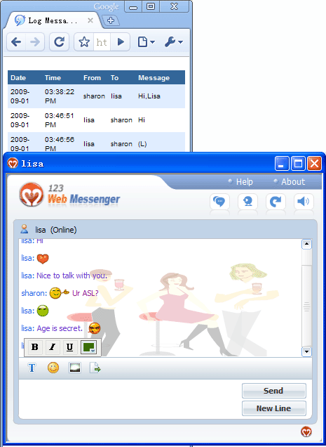 123 Web Messenger can be set in your own style.You can edit your profile and avatars,change the background, choose font style & color, trun on /off online alert, use smilies in private chat, search contacts & view messenger history,etc. Multiple Logon is also supported. Enjoy full Chat Fun in 123 Web Messenger.